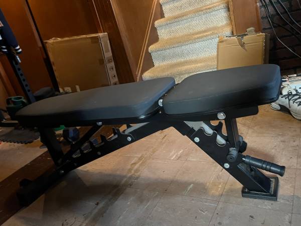 Rep Fitness weight bench. Used it about 2 months during the pandemic and now I’m moving. Goes incline, seat adjustable too. Solid as a rock.