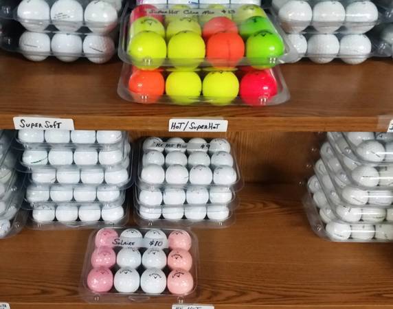Also... Callaway iron sets, drivers, stand and cart bags, golf hand carts (2-wheel, 3-wheel), fairway woods, complete iron sets, hybrids, individual clubs, wedges, putters, golf ball display racks, training aids and thousands of golf balls. Many of the popular brands which include: Titleist, Ping, Cobra, Callaway, Taylormade, Nike, Kirkland, Snell, Srixon, Bridgestone, Volvik, MaxFli, TopFlite, Crystals, matte finish balls, bulk balls, shags, practice balls, Pinnacle, Wilson and others...