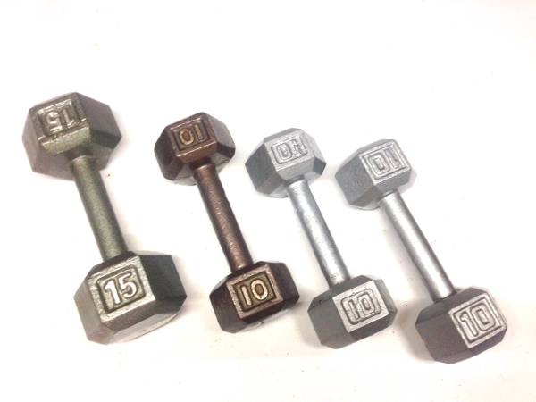 Excellent condition, hammered finish. Dumbbells. Cast iron hex, all for $45. . . Dumb Bell