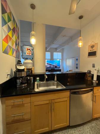 This apartment is equipped with top-quality stainless steel appliances, a dishwasher, espresso machine, blender, and a microwave.