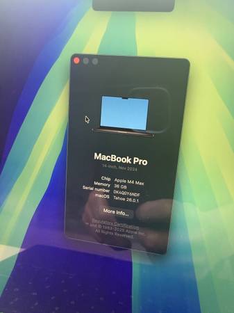 Selling a LIKE NEW MacBook Pro 2024 14" M4 Max 36GB 1TB SSD - Space Black Battery is at 100% and only 11 Cycles as seen in the photos. Latest version of MacOS Tahoe installed. No defects or any...