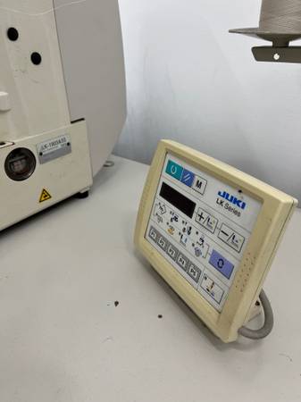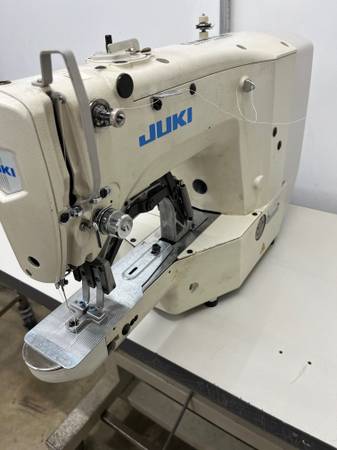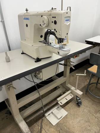 Juki LK-1903A-SS industrial sewing machine for tacking. Currently set up as a tacker, that we use to tack labels onto garments but can also be used for curtain and upholstery. Can easily be converted to a bartack for clothing. Recently serviced by mechanic. In perfect working condition. On adjustable height table on casters to be easily moved. Let me know if you have any questions.