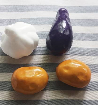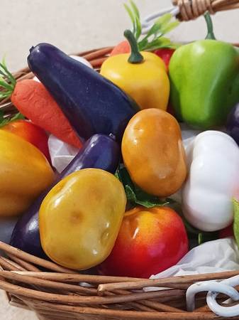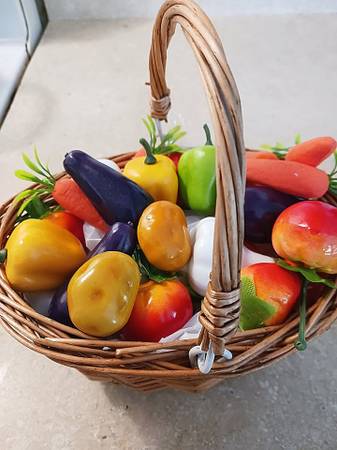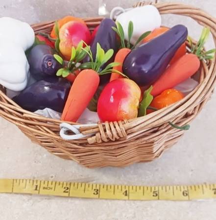 American Girl Doll Garden Accessories. Cute artificial veggies in 6 1/2" wicker basket. Tomatoes, eggplants, peppers, carrots, potatoes, garlic, pumpkins, and strawberries. Life like vegetables. Includes: