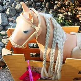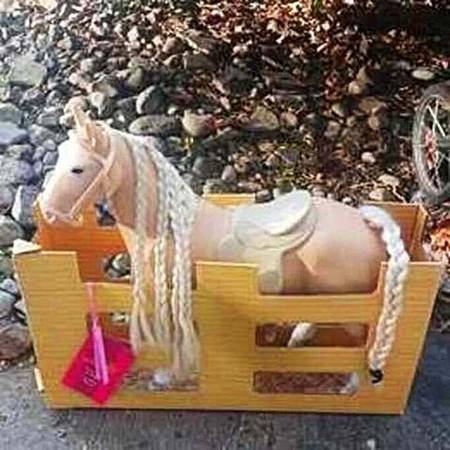 Our Generation Lusitano horse with saddle and stall. Hair is braided but can be undone and combed. Dimensions: 20.5" H x 6" W x 23" L. New cost $58. Ages 3 and up. Like new. Contact Maryann by email...