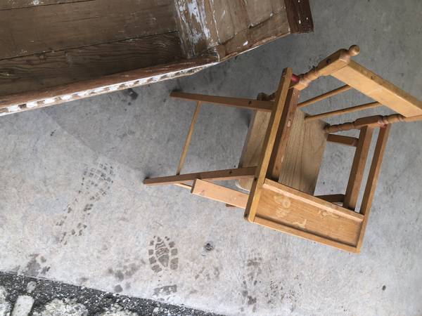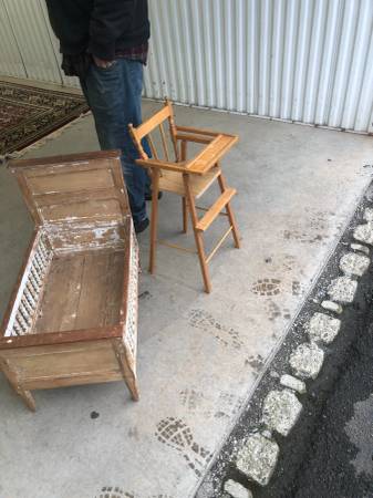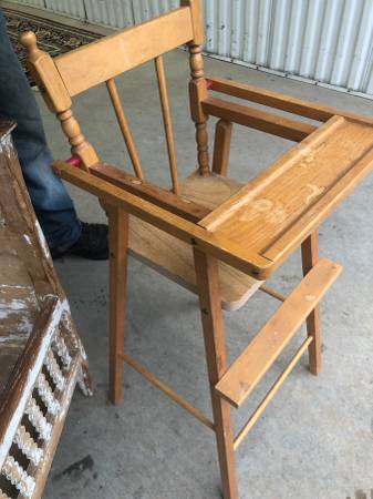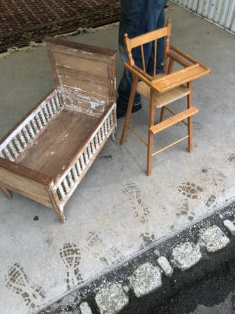 Baby doll crib and highchair Very sturdy Not wobbly $40 for both pieces.