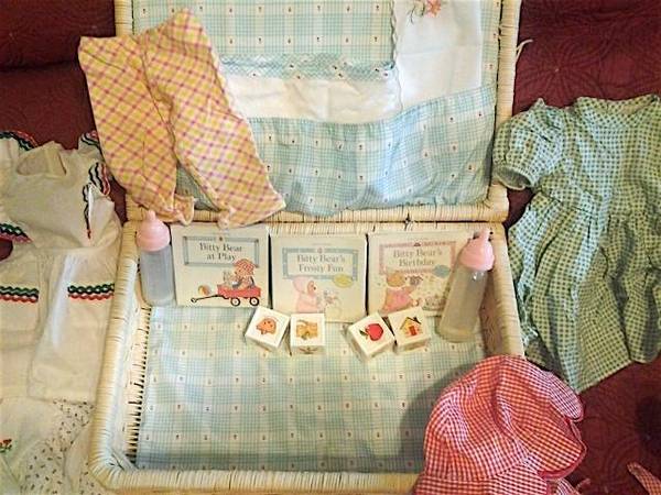 Clean and in great condition, approximately 16 outfits, Selling together only. 3 hats, 1 bitty bear hat, 4 Bitty Baby Blocks, 2 Bitty Bear Suitcases, 3 Bitty Books, 2 Bitty Bottles, 4 pair of shoes,...