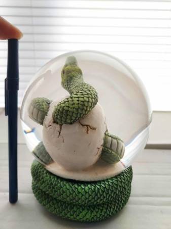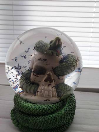 GREEN SNAKE ON SKULL WATER GLOBE WITH FLYING BATS - $25