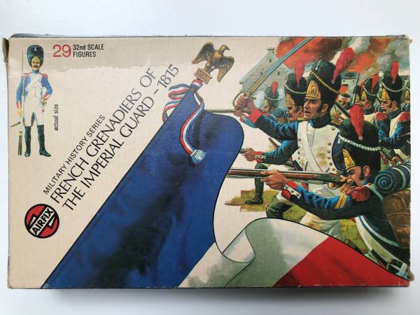 Airfix 1/32 scale original (1973) Code No. 51460-6 French Grenadiers of the Imperial Guard – 1815. All 29 grey plastic figures (11 poses) are in new condition and come in their original box. Military uniform painting guides (front and rear views) are provided on the box.