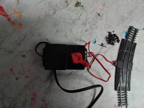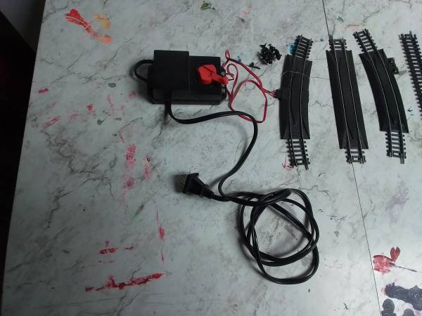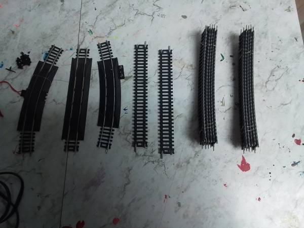 Armstrong H-O train set. Has 2 engines and 3 cargo cars. Comes with 16 pieces of track and controller.