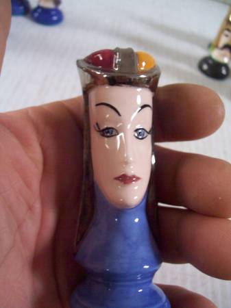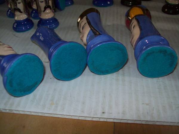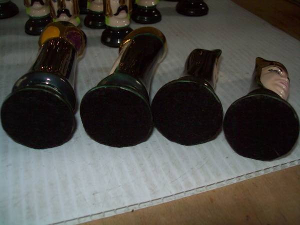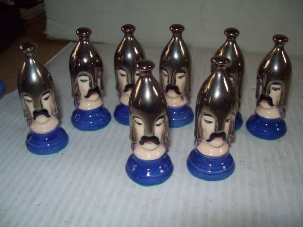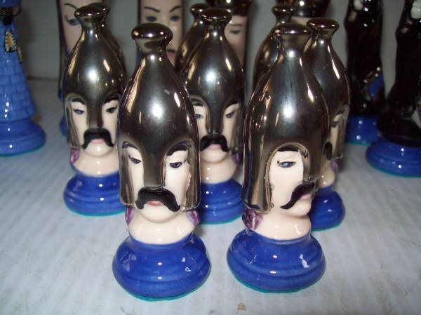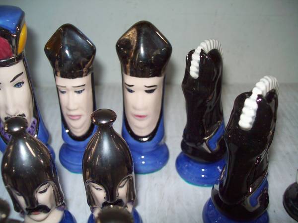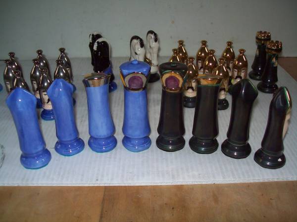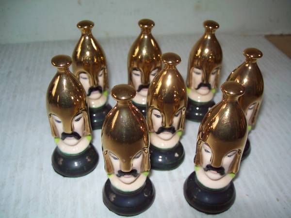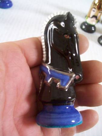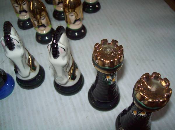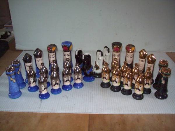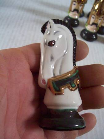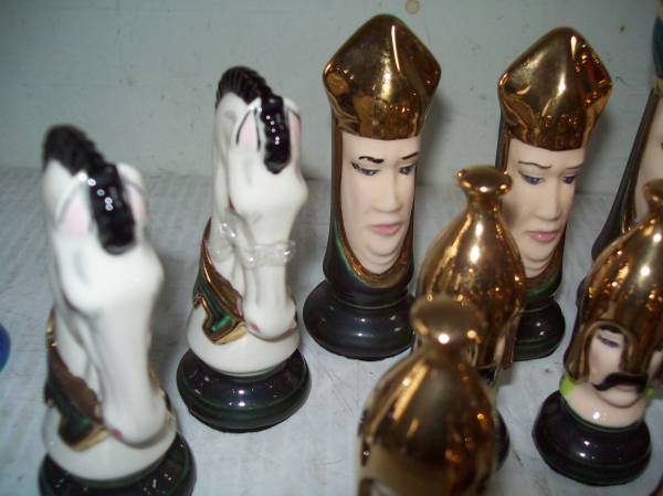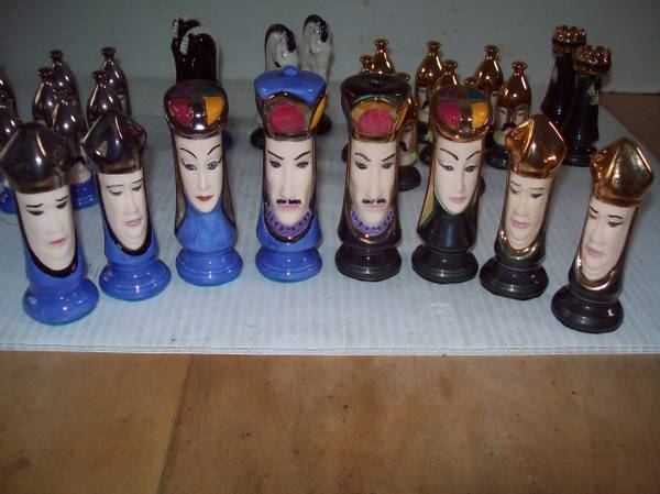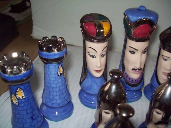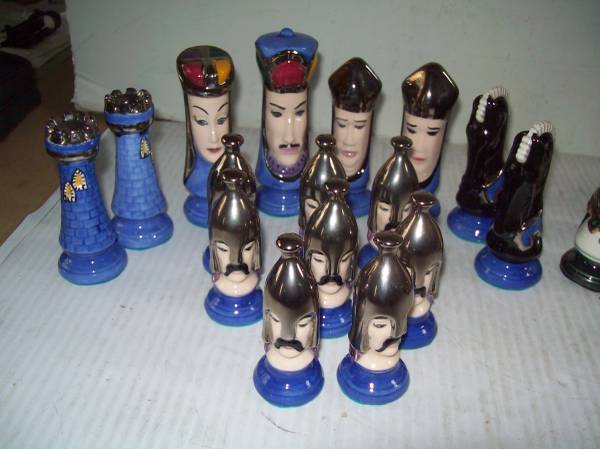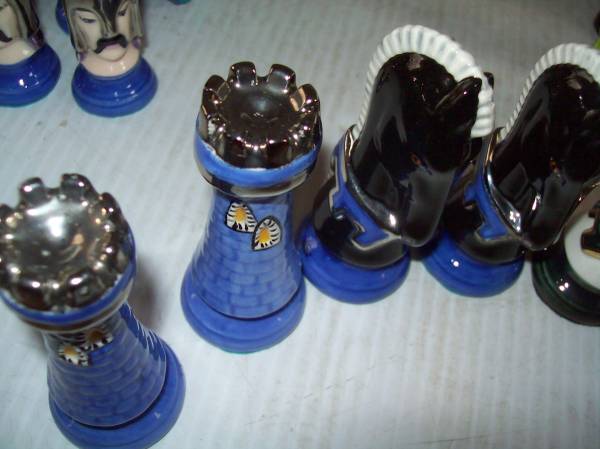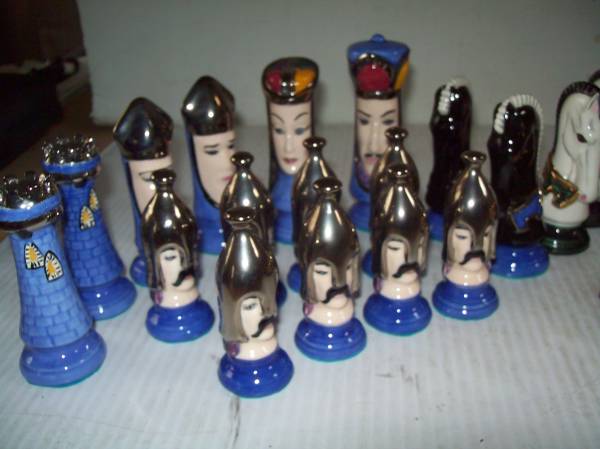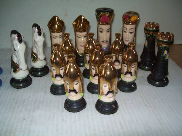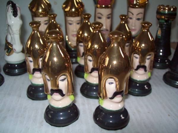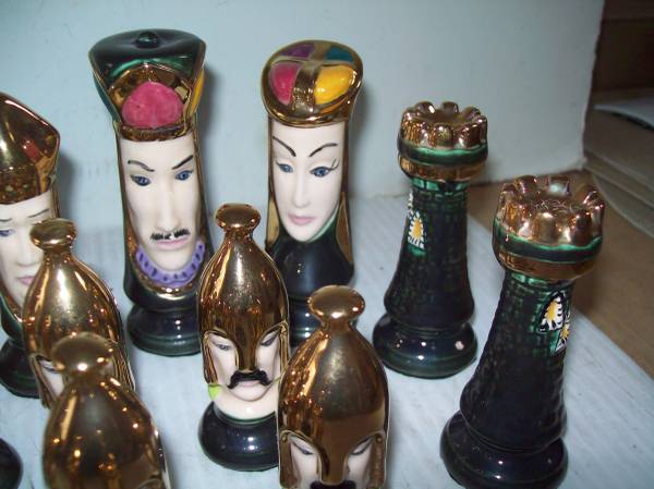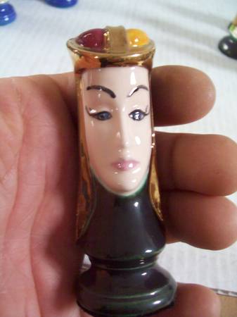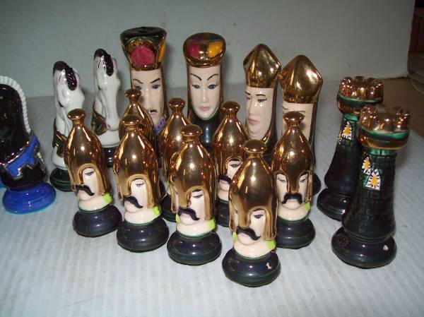 Offered for Sale is this Vintage Duncan Mold Hand Painted Ceramic Medieval Chess Pieces Complete Set in VERY GOOD CONDITION. My photos don't do the colors justice - LOOK AT THIS SET! This set was hand painted and fired, with the resulting colors including the metallics used finishing off incredibly bright and vivid. The attention to detail is extraordinary. Measurements in height: Kings, 4-3/8"; Queens, 3-7/8"; Rooks, 3-3/8"; Bishops, 3-7/8"; Knights, 3-5/8"; and Pawns, 3". This set is available either as a local pick up or through eBay, item #405435762309 . For additional details please go to the listing itself. There are no Facebook sales unless it is by in-person pick up with CASH payment in full. The set is located in Sussex, New Jersey not far from the Vernon high school and minutes from neighboring Town Of Warwick, New York.