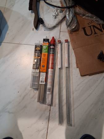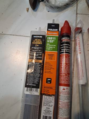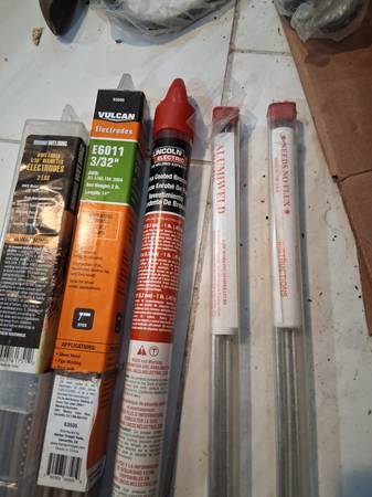 – Rods: E6011 (3/32"), E6013 (1/16"), bronze brazing sticks; two tubes of Alumaweld (note: this welder is not for aluminum stick welding)