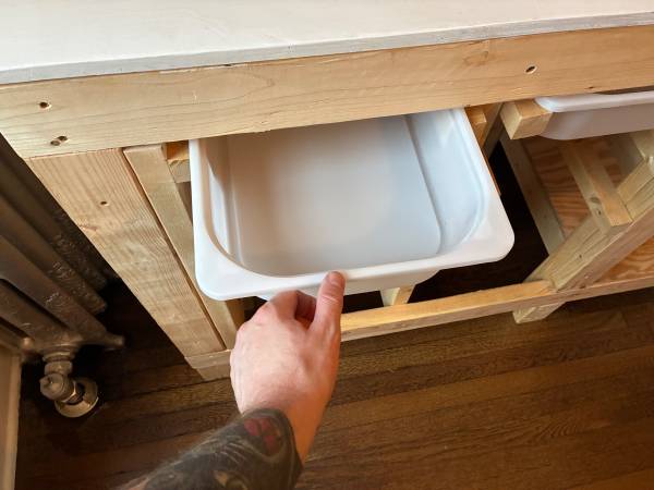 The bench is designed to work with cheap, but strong, Ikea pullout drawers. They're about $6/pc. I won't be including these with the bench as I'll be reusing them but I can send you a link to buy more or you can make your own custom drawers or add shelves, etc.