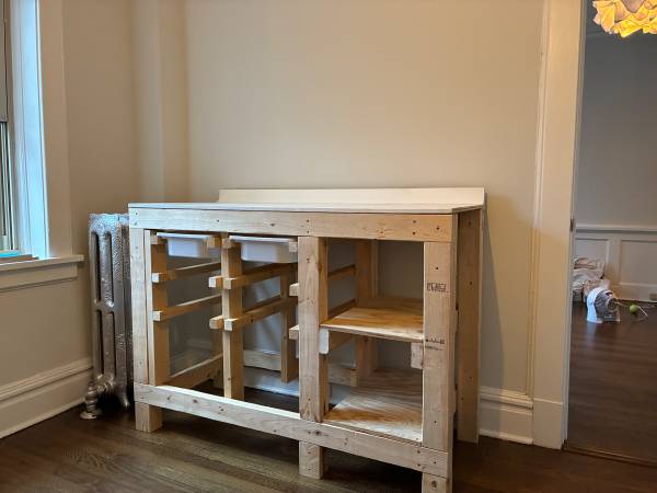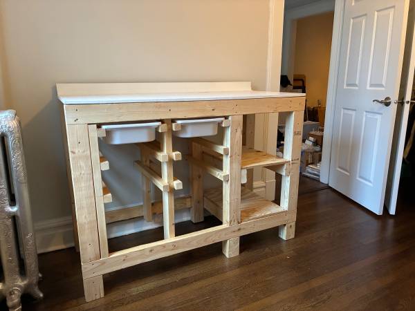 Selling a custom workbench I made for my last apartment. I've moved to a new apartment and will be building something new so I'm selling this one. It's overbuilt and incredibly strong. I had a 200lb laser cutter on this, but it could easily hold several hundred pounds. The size is 24"D x 56"W x 40"H. I'm pricing it to sell quickly so I can make space, as this is less than what I spent in lumber.