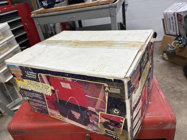 New 3.5 gallon parts washer for removing grease /grime from any car / bike / motorcycle / lawnmower parts or any device that needs a good cleaning. I've had this on the shelf for years in the original box never used or taken out. It is ready to move as I downsize my gagrage space. Pump, sprayer, cord all mounted to the steel tank with a hinged cover for easy storage.
