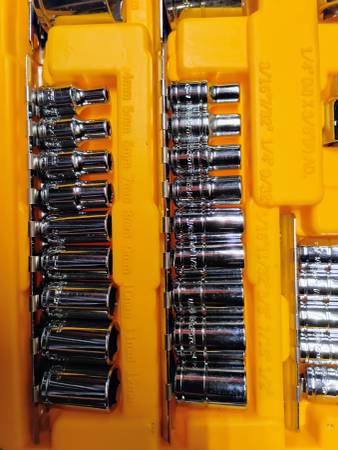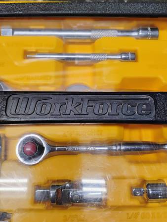 NEW Workforce ratchet dive set. Chrome Vanadium Steel. 1/4-inch and 3/8-inch drives, sockets and Allen wrenches. 69 pieces total plus the case and socket holder clips and Allen wrench sleeves....
