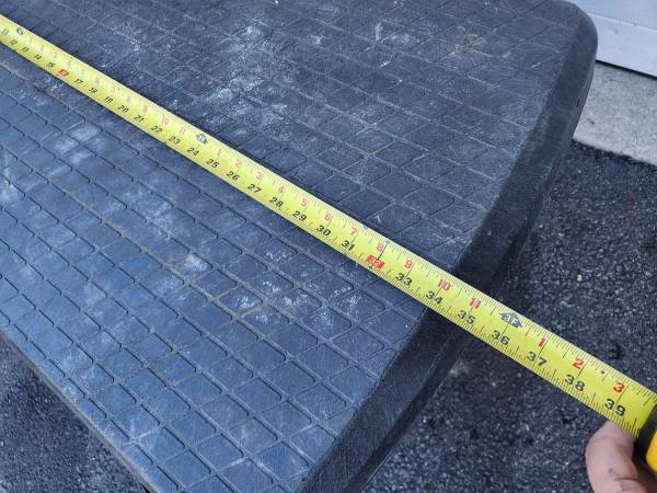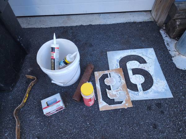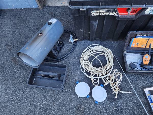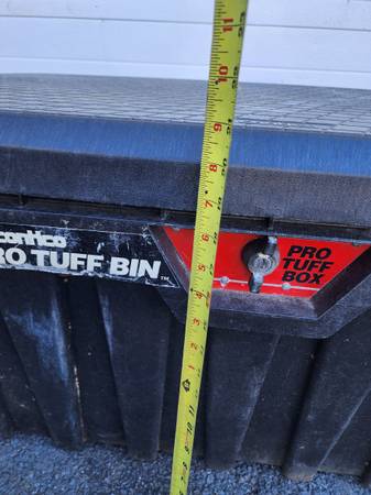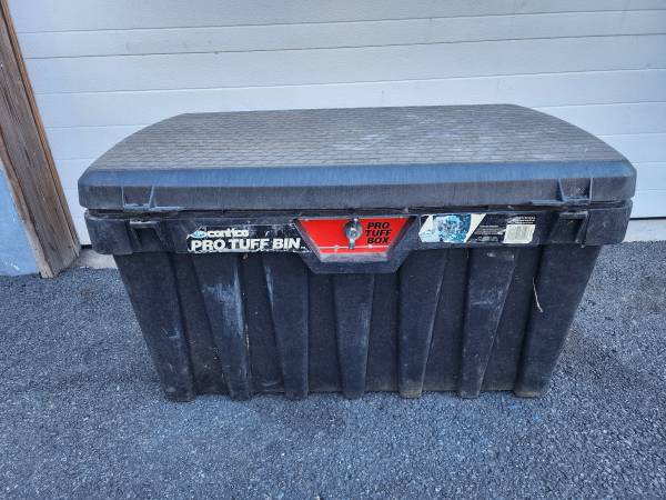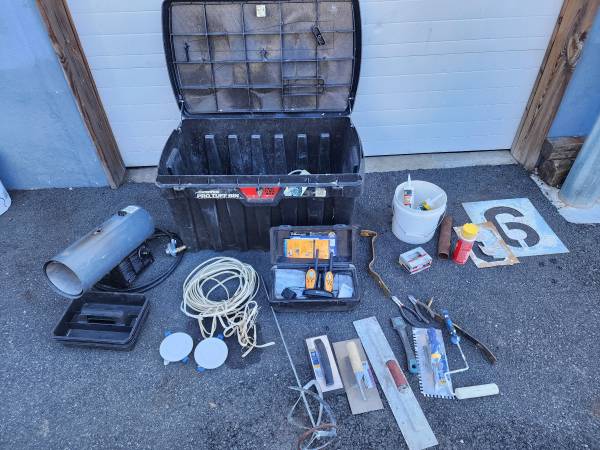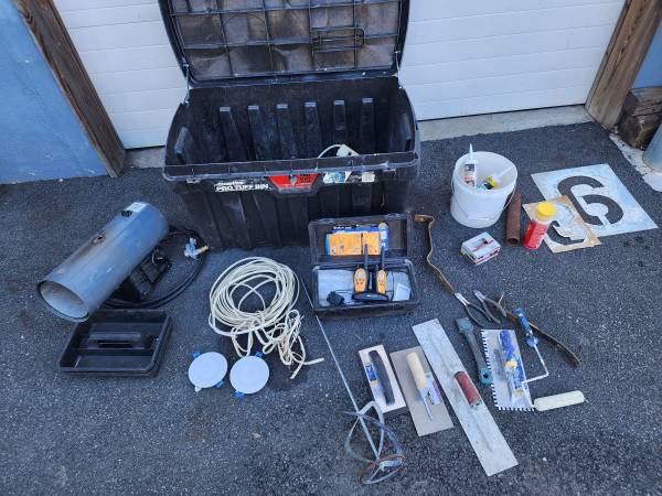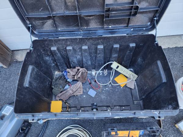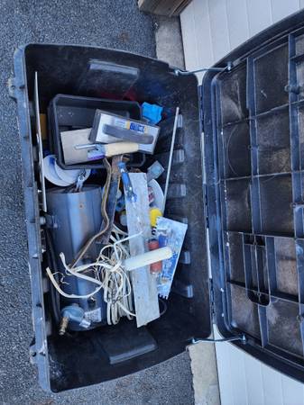 Contico Pro Tuff Bin tool box (no Key) with assorted hand tools, Pliers, concrete Float, Tile Notch Trowel, Mortar Mixer Paddle, electrical wire, Pry bars, hand radios (untested), Everything that...