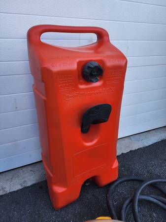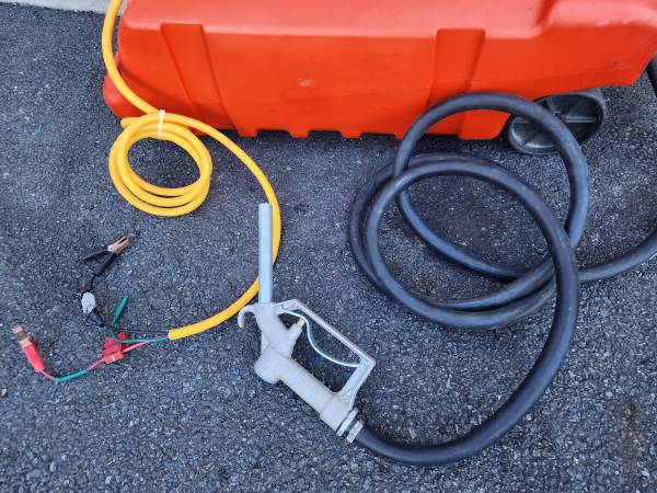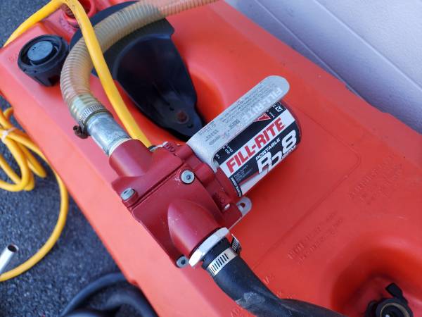 Fill-Rite RD812NH 12V 8 GPM Portable Fuel Transfer Pump w/Discharge Hose, Manual Nozzle, Power Cable/Clips, Suction Hose (New Condition) and Duramax 14 Gallon Wheeled Utility Transfer Tank Portable Rolling Container for Equipment, Tractors, Boats, Jet Skis, ATVs and Jobsite Transport.$350 for everything.