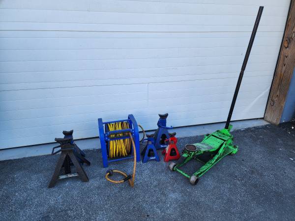 Package deal only, $180 for everything. DAYTONA 3 Ton Low-Profile Professional Floor Jack with RAPID PUMP in good condition, Car jack stands and Portable Industrial Air Hose Reel (non-retractable,...