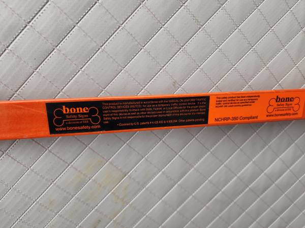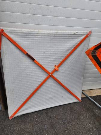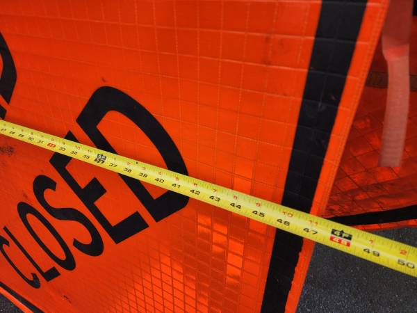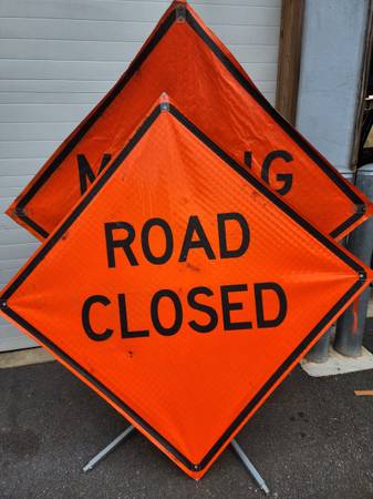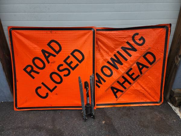 Lot MDI Single Spring Sign Stand & (2) 48" Street Signs "Road Closed" and "Mowing Ahead", in good condition, $100 for everything.