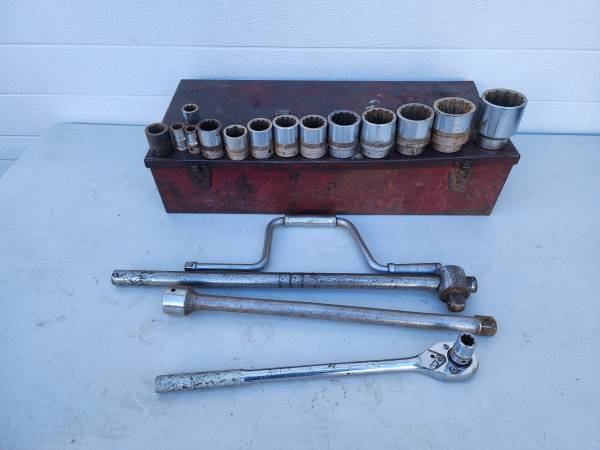 Milwaukee Heavy Duty Pneumatic Impact Wrench 3/4" Model MP 155 with assorted sizes Bonney and Husky made in USA 3/4"anf 1/2" drive sockets, 15/16", 1", 1-1/16", 1-1/8", 1-5/16", 1-7/16", 1-1/2", 1-5/8", 1-13/16" to mention some, extension and other accessories.
