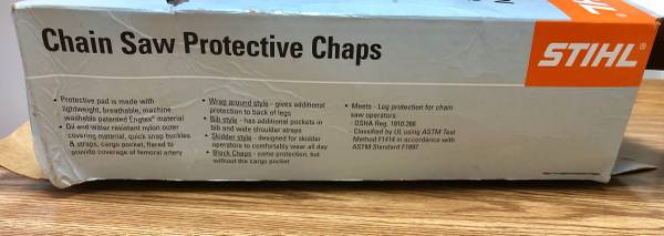 Stihl model #886-3204 Chainsaw Chaps ( New ) Length: 36” Waist: 30”-42” Color : Black ( have 1 ) Color: Orange ( sold ) Offered at: $90 each ( Cash and Carry Only )