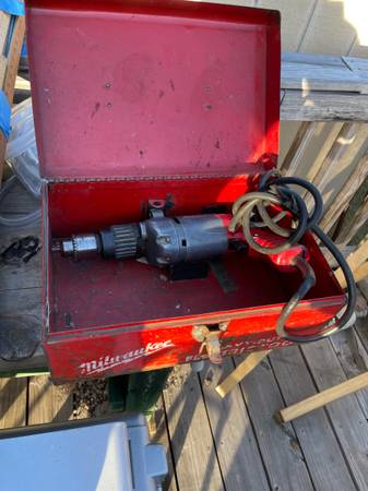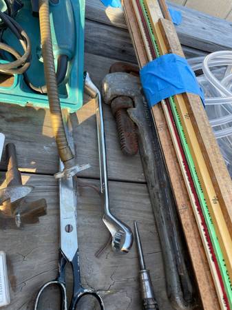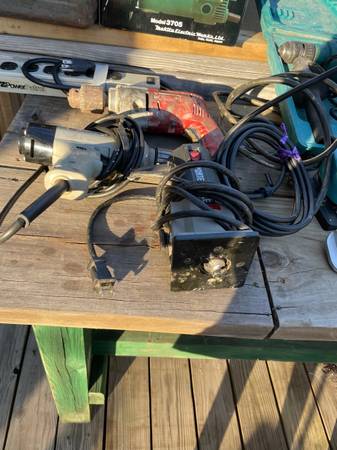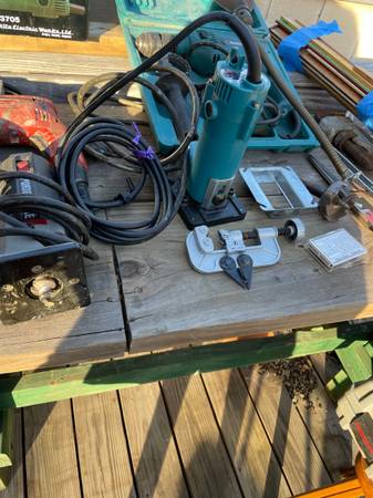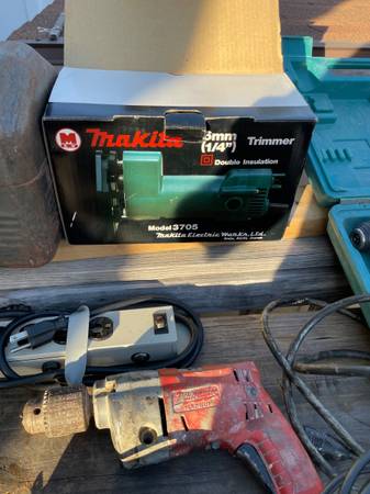 3 Milwaukee drills. 1 Rockwell 2 makita. 1 complete roto zip case. Antique light. 18 in rigid aluminum wrench. Makita trimmer. 12 in fabric shears porter cable router. elec strip