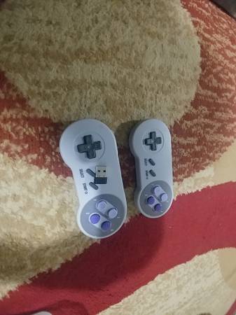2 x 2.4gz Wireless Controllers SNES Form factor Rechargeable via micro usb connector at top Includes usb dongle