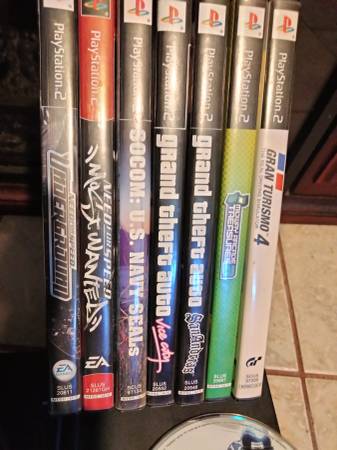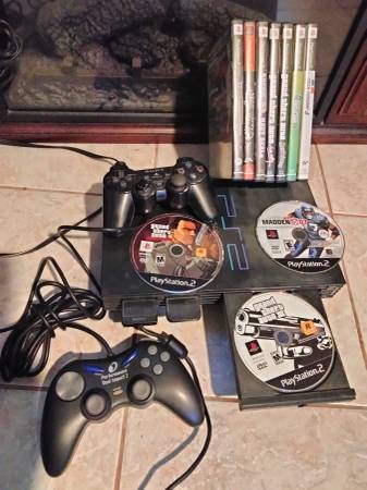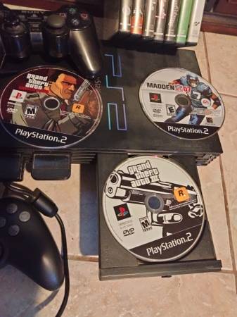 Sony Playstation 2 PS2 Fat Console and controllers with 10 Black Label games including GTA Vice City GTA San Andreas Need For Speed Most Wanted Need For Speed Underground Midway Arcade Treasures 2 Gran Turismo 4 and Socom: Us Navy Seals "CIB". The Bundle includes everything shown in photos. One 8MB Memory Card. TV not included. All games in boxes are complete. GTA III, GTA Liberty City Stories and Madden 07 are disc only. See photos for details on appearance and condition. Cash Only. Pick up only in Guttenberg, NJ. Thanks!