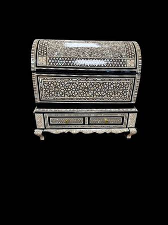 Vintage Exquisite Egyptian Mother-of-Pearl Inlaid Jewelry Box. This type of decorative box is a testament to the intricate artistry of Egyptian craftsmanship, particularly the skill in inlay work that has been passed down through generations.