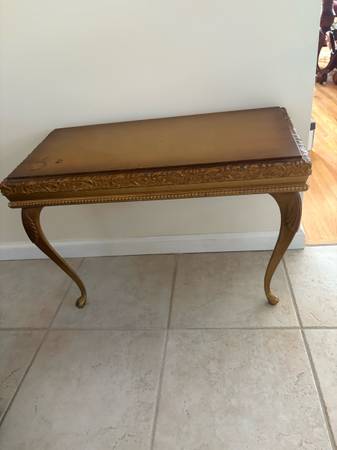 Wood with metal legs. Dimensions: 24” x 12” x 16” high It has 2 legs and 2 hooks that are mounted with screws to the wall