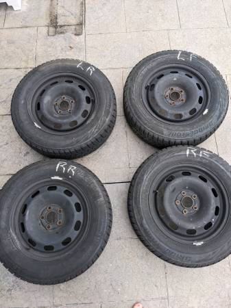 Set of 4 Bridgestone Blizzak 195/65R15 winter tires on 5x100 R15 steel wheels. Used for two winters on a Toyota Prius and have plenty of life left on them. Tires are marked with previous mount location on FWD car so they can be rotated correctly next mounting.