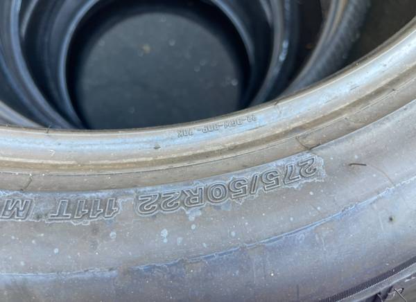 275/50/22 Bridgestone used set of matching tires in great condition 350$ for 4 tires plus tax .
