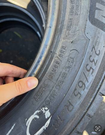 235/65/18 Michelin 80% used set of matching tires in great condition 350$ for 4 tires plus tax .
