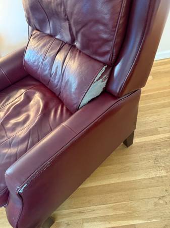 Maroon leather power recliner. 9 years old. Still working - average condition for age. Some wear on sides of chair. See photos.